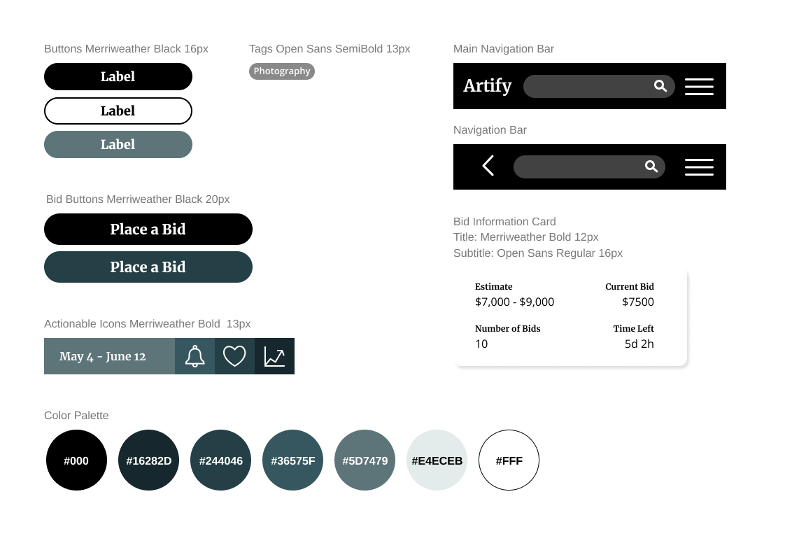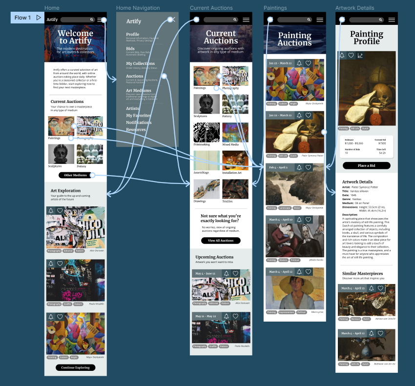 I conducted empathy maps, moderated usability studies, and an affinity diagram to understand users’ ability to navigate the preliminary layouts of the Artify app. Through this research, I found that art enthusiasts of all levels of experience wanted more bidding information and a way to manage their collections. It was important that I made sure the app is accessible to both novice and seasoned collectors.