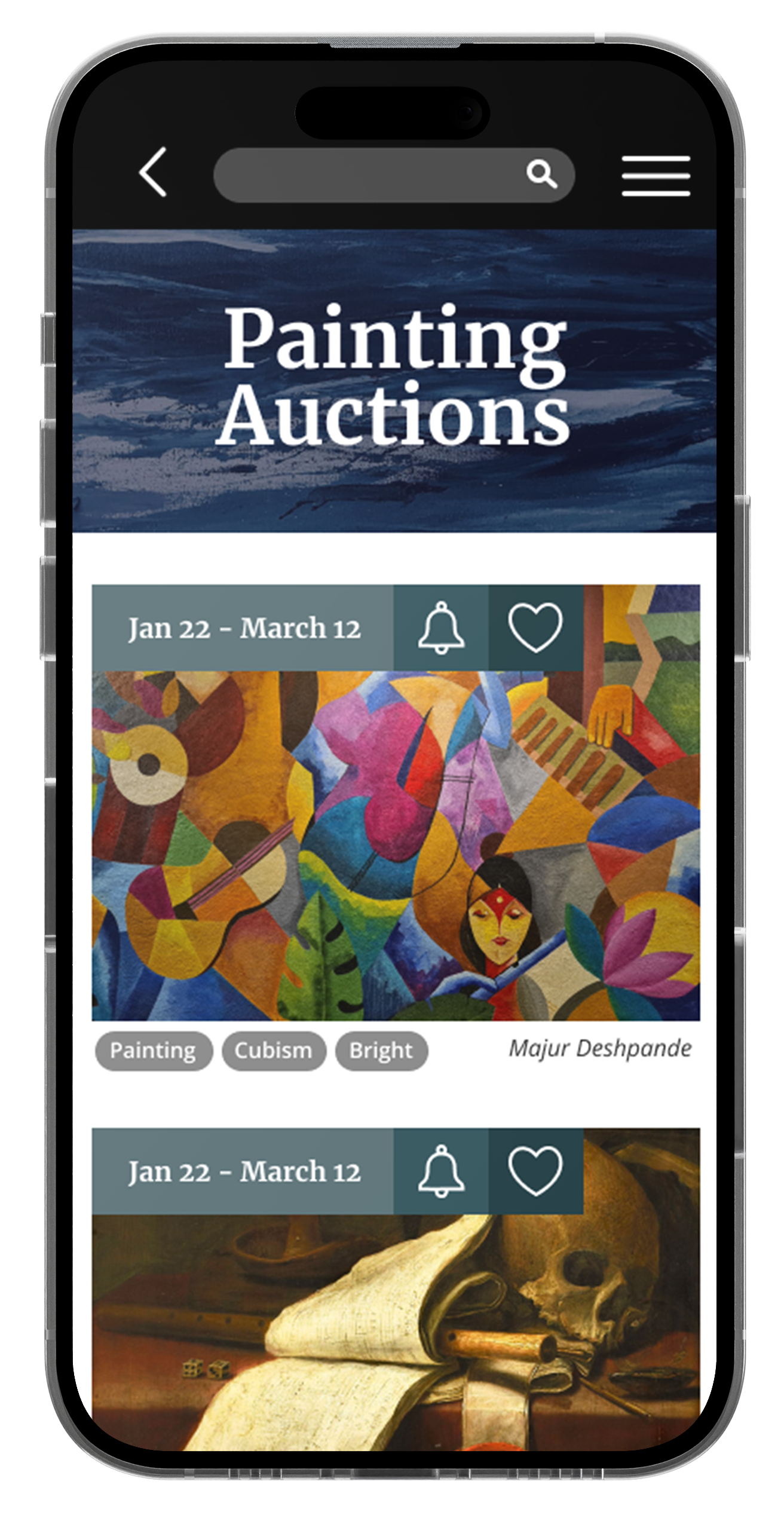 The search functionality feature on the Artify auction app allows users to quickly and easily find items of interest by inputting specific keywords or filtering by category, artist, or price range. This feature helps users to efficiently navigate the app and discover unique pieces that fit their preferences and budget.