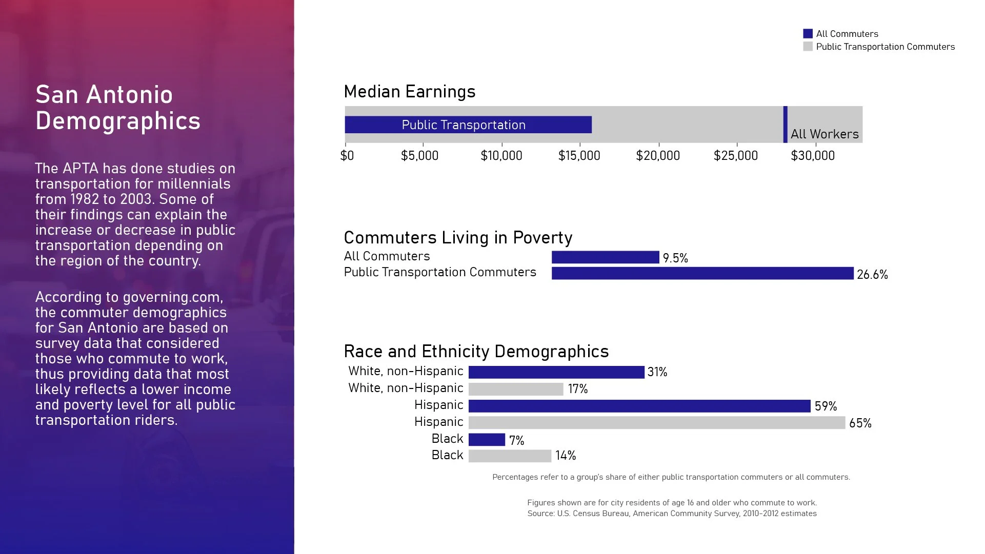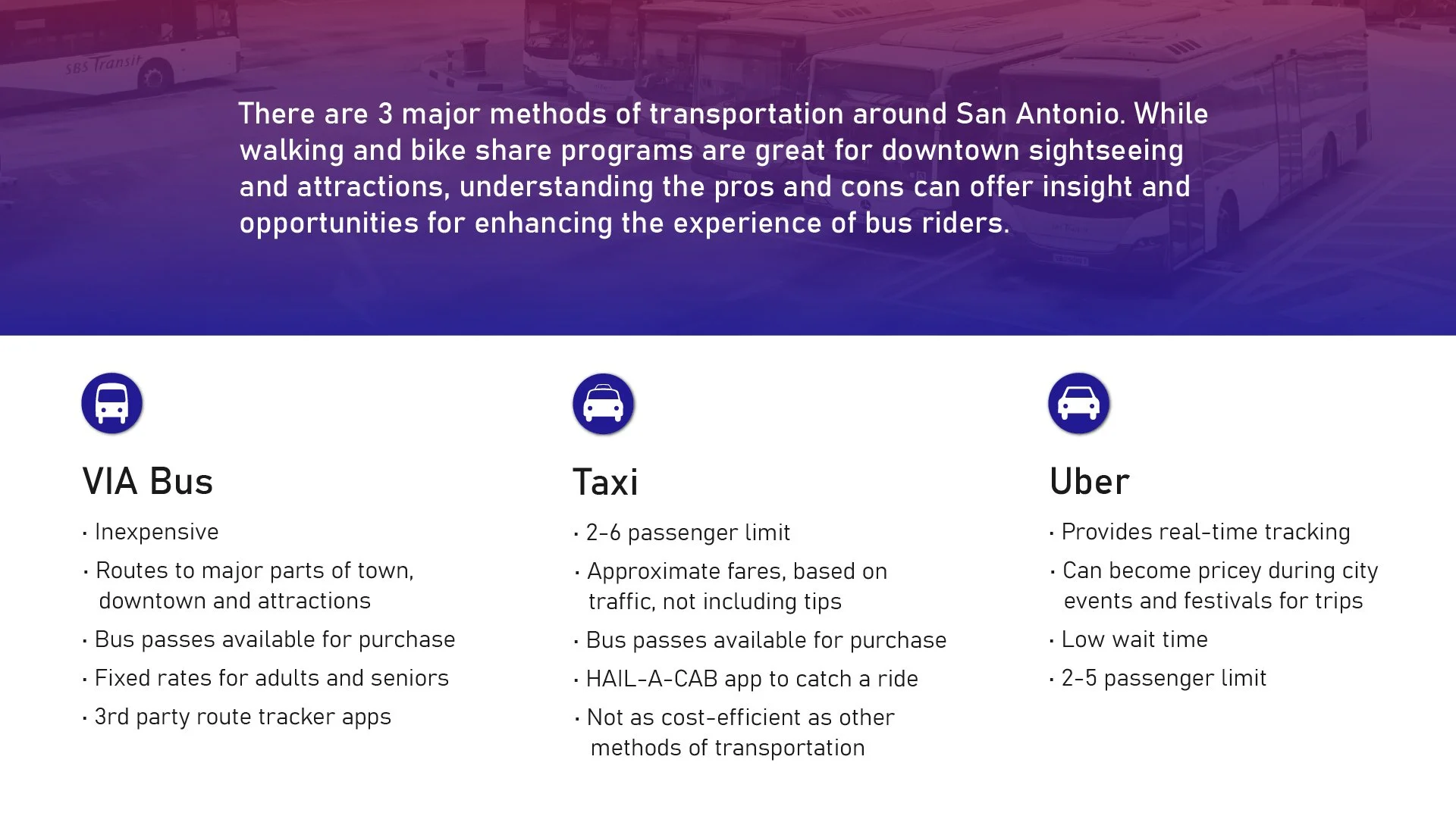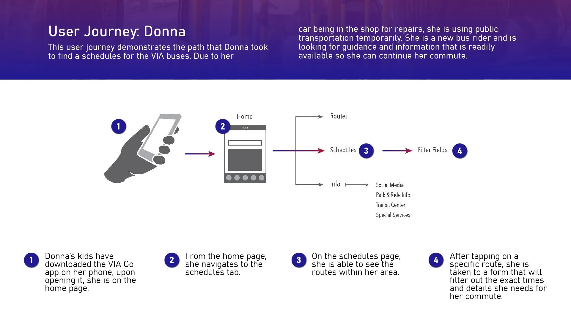 Donna is a mother of 2 children who are in middle and high school. After her divorce, she was forced to move into an apartment downtown. Her car is currently in the shop for repairs and is getting around to town with VIA buses. Because she is new to this method of transportation in a new town, she is struggling to track buses and routes.