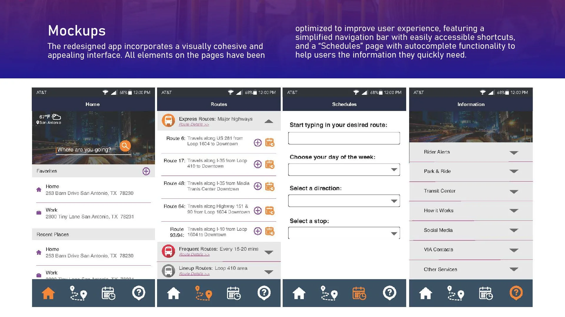 This project exemplifies my ability to analyze user needs and design pitch decks that are effective and visually appealing. By focusing on the user's needs, I was able to streamline navigation, improve search functionalities, and build a story around the bus rider’s experience.